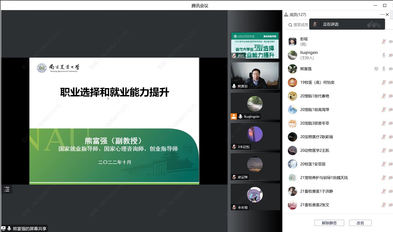 10月8日,学院组织开展了“当代大学生职业选择和就业能力提升”主题线上讲座,邀请了南京农业大学组织部熊富强副部长主讲,讲座由学院党总支副书记刘庆新主持,学院在校学子两百余人参加。