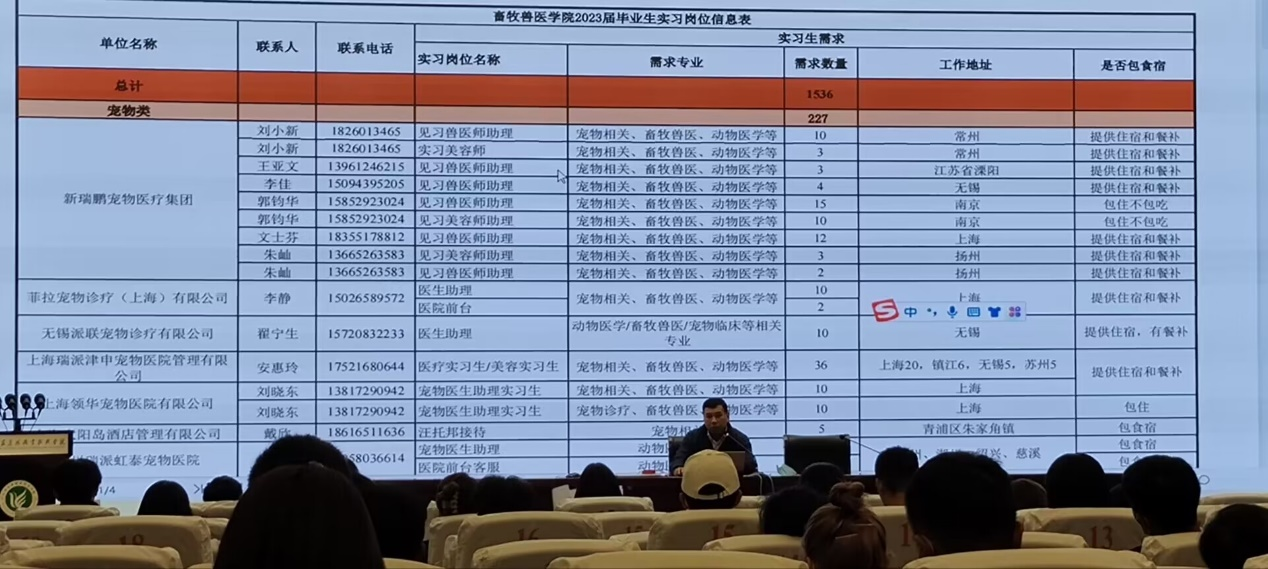 会上,刘庆新分畜牧兽医、宠物医疗、实验动物、水产养殖四大类简要介绍了实习招聘单位情况,并布置了实习前期工作安排。他表示,实习作为学习与工作的缓冲,对于学生职业生涯的发展起着重要的作用,他希望牧医学子们通过本次实习,实践所学知识、积累社会经验,亲身体验目标工作的具体内容,为毕业后的就业征程打好基础。