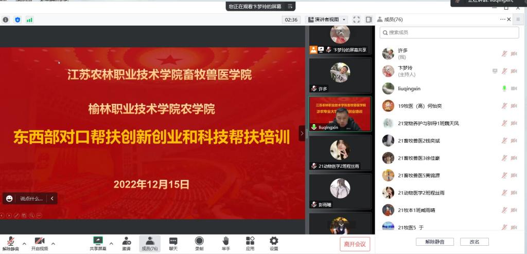 12月15日晚,我院联合榆林职业技术学院开展线上东西部对口帮扶创新创业和科技帮扶培训活动。会议由学院党总支副书记刘庆新主持,活动邀请了第七届“互联网+”创新创业大赛银奖获得者张静对历届大赛进行解读,分别从选题、项目计划书、PPT等方面进行细致讲解。同时,我院和榆林职业技术学院科技人员针对红枣羊的养殖技术和大学生创新创业项目的开展进行了探讨和交流。