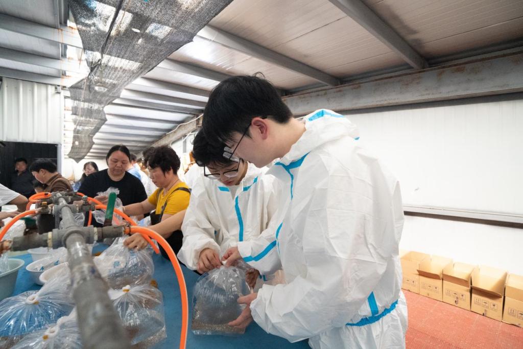 公司总经理叶少群对学院师生表示热烈欢迎,并详细介绍了江苏鼎和近年来的发展历程。随后,双方围绕产学研合作、人才培养、实习就业等议题进行了深入交流,并达成多项合作共识。在叶少群总经理的带领下,水产养殖专业学生深入罗氏沼虾养殖一线,实地观摩了种虾培育、虾苗喂养等关键生产环节。在虾苗包装车间,同学们分组协作,亲手完成虾苗充氧、封袋、装箱等工序,沉浸式感受企业真实生产流程。