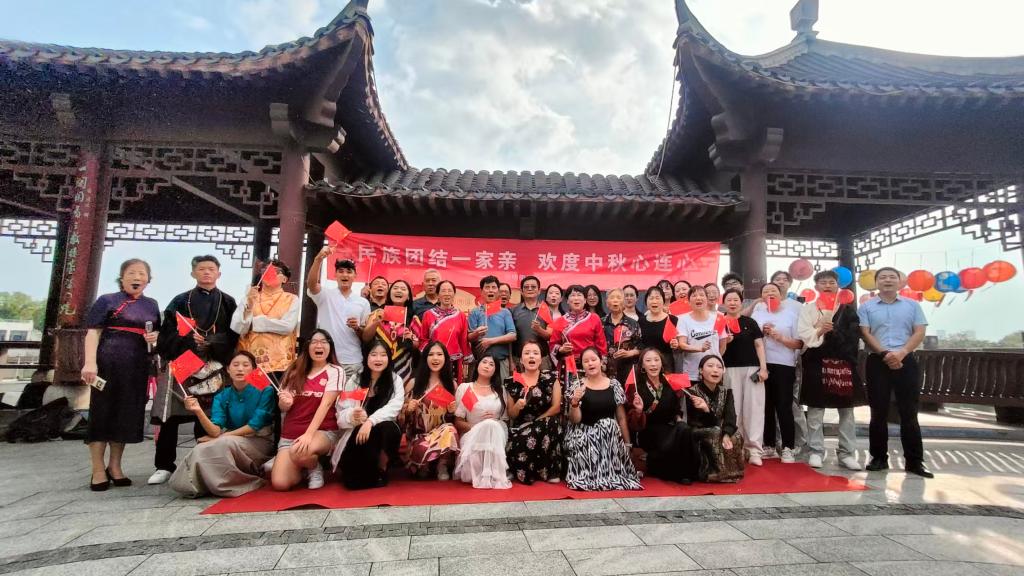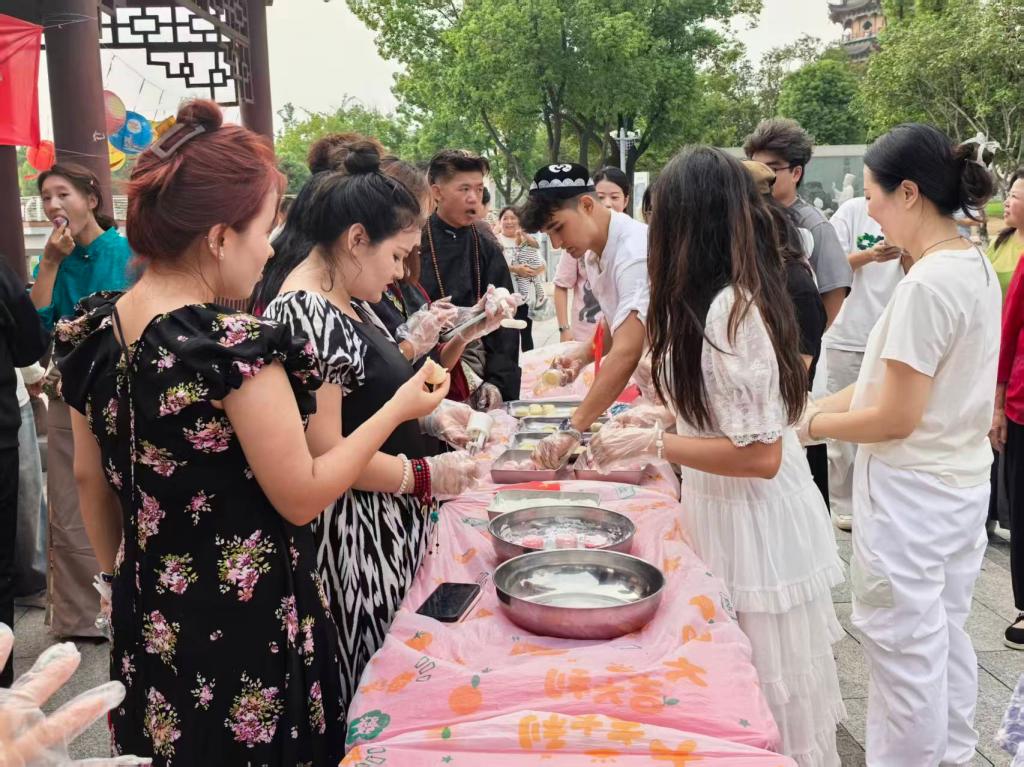 在葛仙湖公园,大红灯笼高高挂起,鲜艳的国旗迎风飘扬。活动现场,不仅有来自新疆和西藏的少数民族同学展示具有特色的民族舞,居民们也欢聚一堂,参与趣味游园、灯谜竞猜、手工月饼制作等环节,欢声笑语不绝于耳。孩子们手提各式花灯穿梭嬉戏,老人们围坐品茗闲话家常,一派和谐景象。