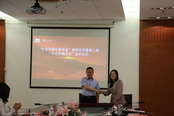 颁奖仪式上,葛国君书记首先致欢迎辞,对大北农集团在畜牧兽医学院设立奖学金表示衷心的感谢,充分肯定了大北农集团与畜牧兽医学院共同合作办班的意义,“大北农精英班“既满足了行业龙头企业对高素质技能型人才的需求,也是我院人才培养方式的创新。刘庆新副书记宣读了表彰决定和名单,来自畜牧兽医学院的杨昕雪等15位学生获得了“大北农励志奖学金”。