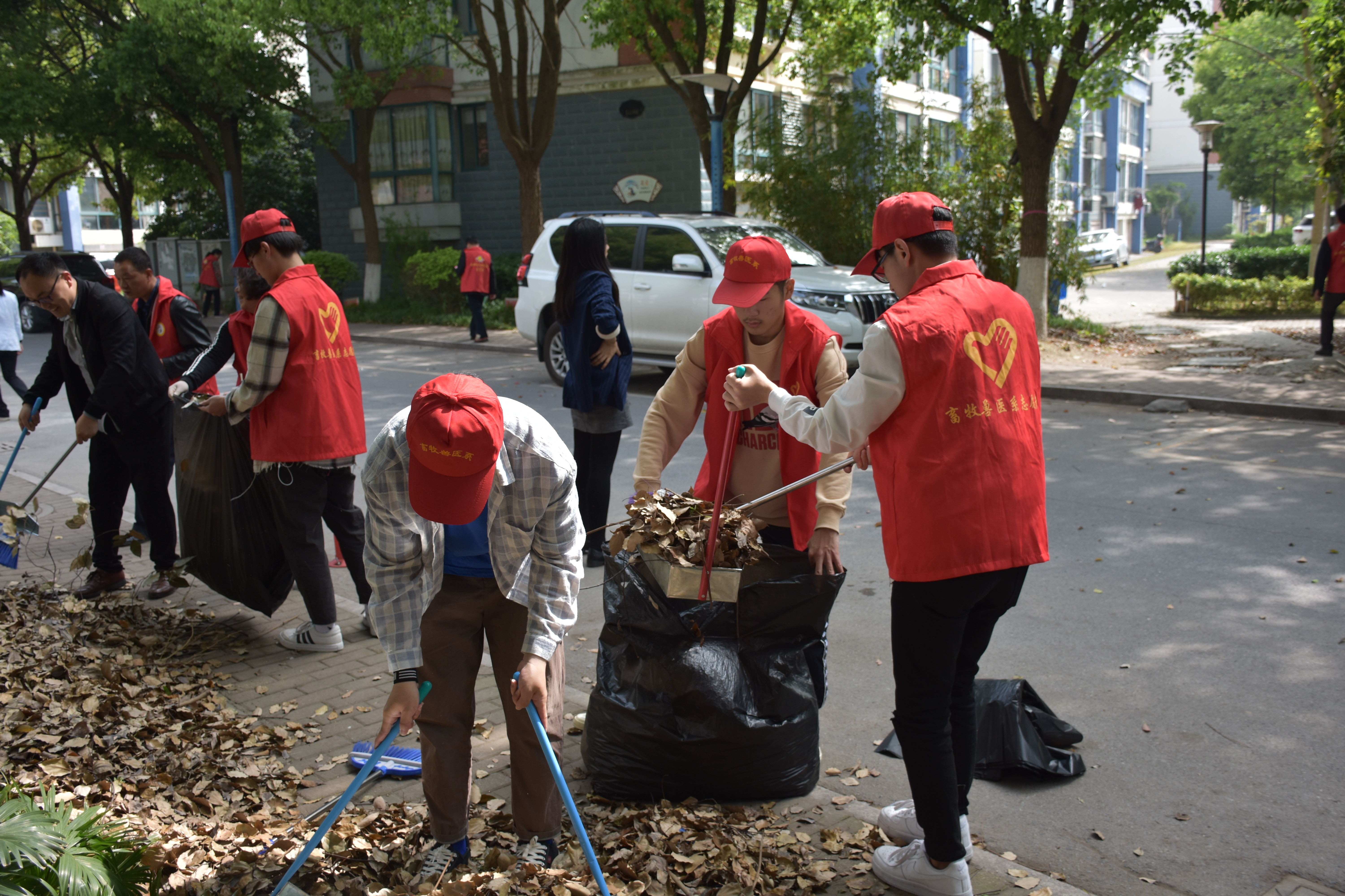 烈日炎炎下,志愿者们不辞辛劳,在工作指定地点共同努力劳作,清扫街道、花坛中的落叶,并将所有落叶集中清理在垃圾袋中。经过大家的努力,垃圾箱旁堆满了一袋又一袋的落叶,这一袋又一袋的垃圾袋里,装的不仅仅是地上的落叶,更多的是大家共同努力的那份情谊、自己人生道路的成长、对社会的一份责任心。