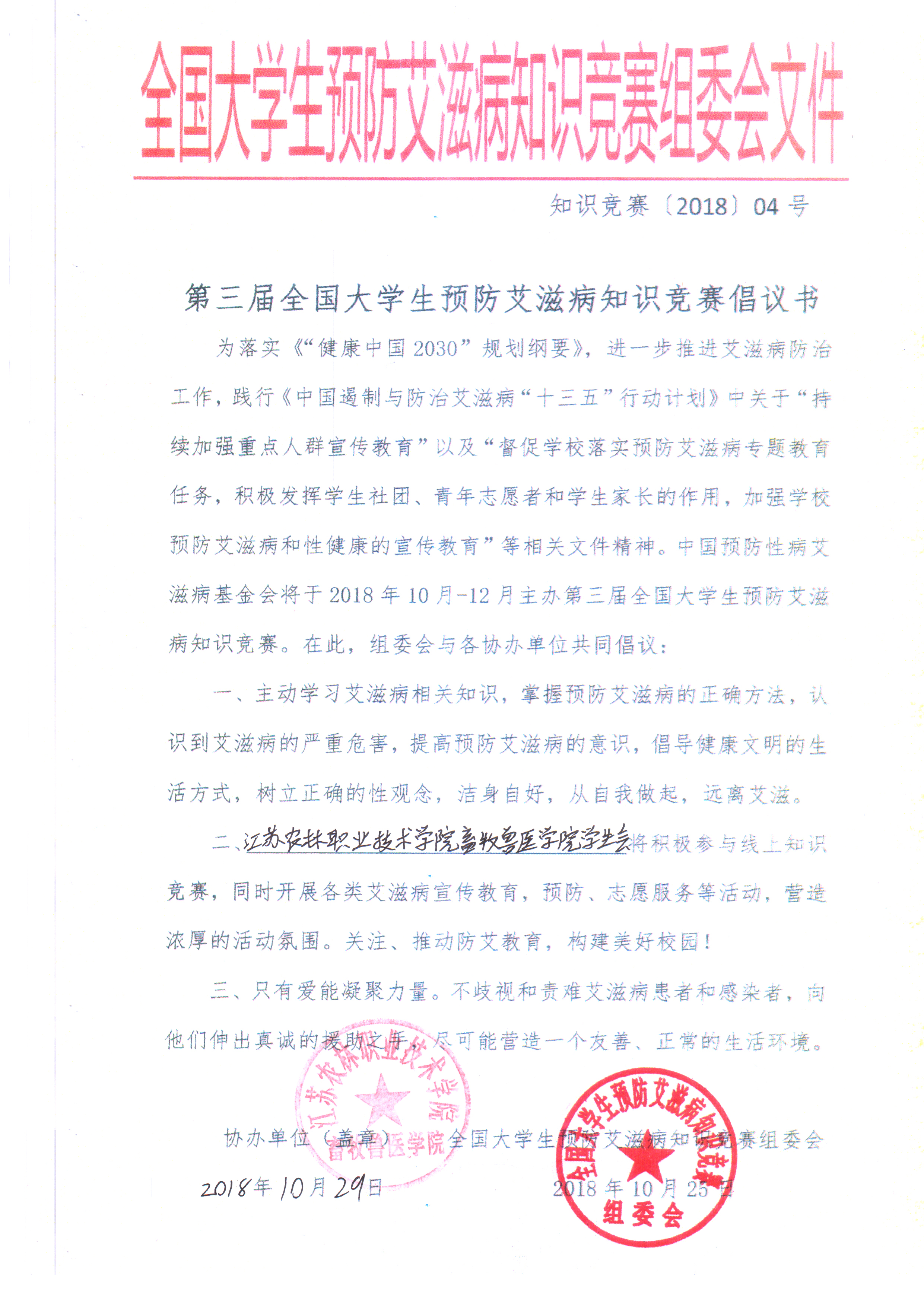 2018年12月1日是第31个“世界艾滋病日”。为落实《“健康中国2030”规划纲要》,进一步推进艾滋病防治工作,践行《中国遏制与防治艾滋病“十三五”行动计划》中关于“持续加强重点人群宣传教育”以及“督促学校落实预防艾滋病专题教育任务,积极发挥学生社团、青年志愿者的作用,加强学校预防艾滋病和性健康的宣传教育”等相关文件精神。2018年11月,由中国预防性病艾滋病基金会主办,江苏农林职业技术学院畜牧兽医学院承办的“2018年第三届全国大学生预防艾滋病知识竞赛”拉开帷幕。