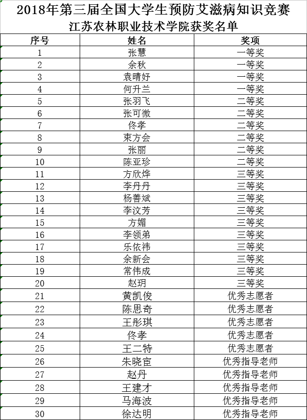 在为期两个月的时间里,在畜牧兽医学院的组织下,全校同学积极参与,答题人数达到3571名。张慧、余秋等4位同学获得一等奖。张羽飞、夏黎明等6位同学获得二等奖。方欣烨、李丹丹等10位同学获得三等奖。黄凯俊、张可微同学获得“优秀组织者”荣誉称号,陈思奇、王彤琪等5位同学获得“优秀志愿者”荣誉称号。朱晓宦、王建才等5位老师获得优秀指导教师奖。江苏农林职业技术学院畜牧兽医学院学生会获得“优秀组织单位”荣誉称号。