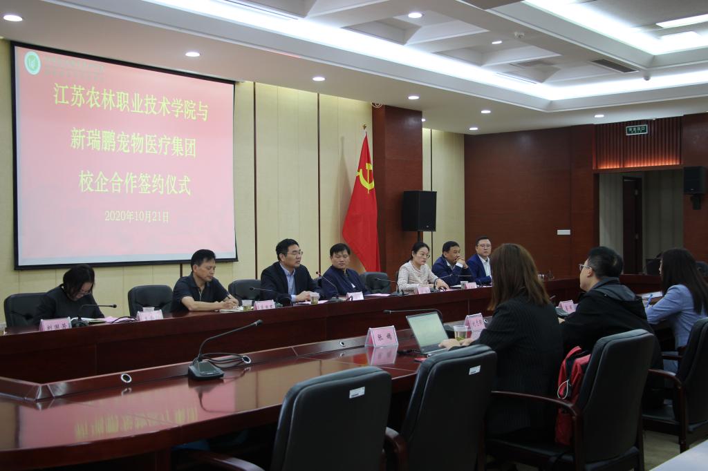 10月21日上午,我院与新瑞鹏宠物医疗集团有限公司签订校企合作协议暨现代学徒制班签约仪式在综合楼九楼会议室举行,我院朱孟玲院长主持会议。校党委委员、副校长曹仁勇首先介绍了我校在专业设置、人才培养、校企合作、社会服务和国际交流等方面的取得的成就。新瑞鹏宠物医疗集团有限公司副总裁李丽女士从优秀校友、企业规模、市场前景、人才需求等方面介绍了新瑞鹏宠物医疗集团有限公司发展近况。