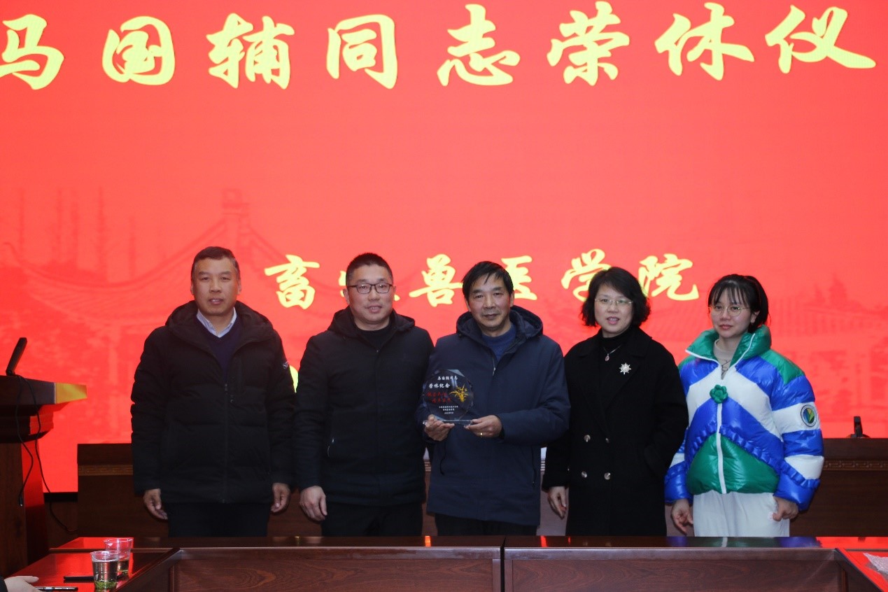 首先,组织人事处王慧媛副处长宣读了退休通知,并向马老师送上诚挚的祝福。汪善锋院长向参会人员介绍了马国辅老师的工作经历,并代表学院向马老师多年来为学院发展做出的贡献表示由衷的敬意和诚挚的谢意。与会人员深情回顾了与马老师共事的点点滴滴,充分肯定了马老师正直善良、低调谦逊的优良品质,兢兢业业、勤于奉献的工作态度,高度赞扬了他在实验室建设、教学等方面所作出的贡献。马老师也向参会人员分享了自己的求学、工作等经历,表达了对畜牧兽医学院大家庭的不舍眷恋,感谢学院领导和同事们一直以来的关心帮助。并鼓励年轻教师扎根专业,不断学习、不断提升自己。他表示,会继续关心关注学院的发展,祝愿学院的各项事业越来越好,祝愿各位同事事业有成。我院优秀毕业生孙可可到会向马老师献上鲜花。汪善锋院长代表学院为马老师颁发荣休纪念品并合影留念。
