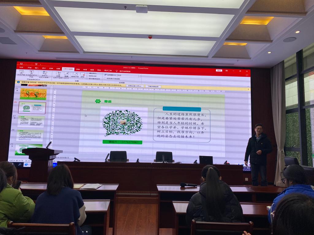 蒋铭午书记向参会师生介绍了自己从学生到建新社区党委书记的发展历程和每个阶段的思想感悟。从自己工作十几年的经验总结做了分享。