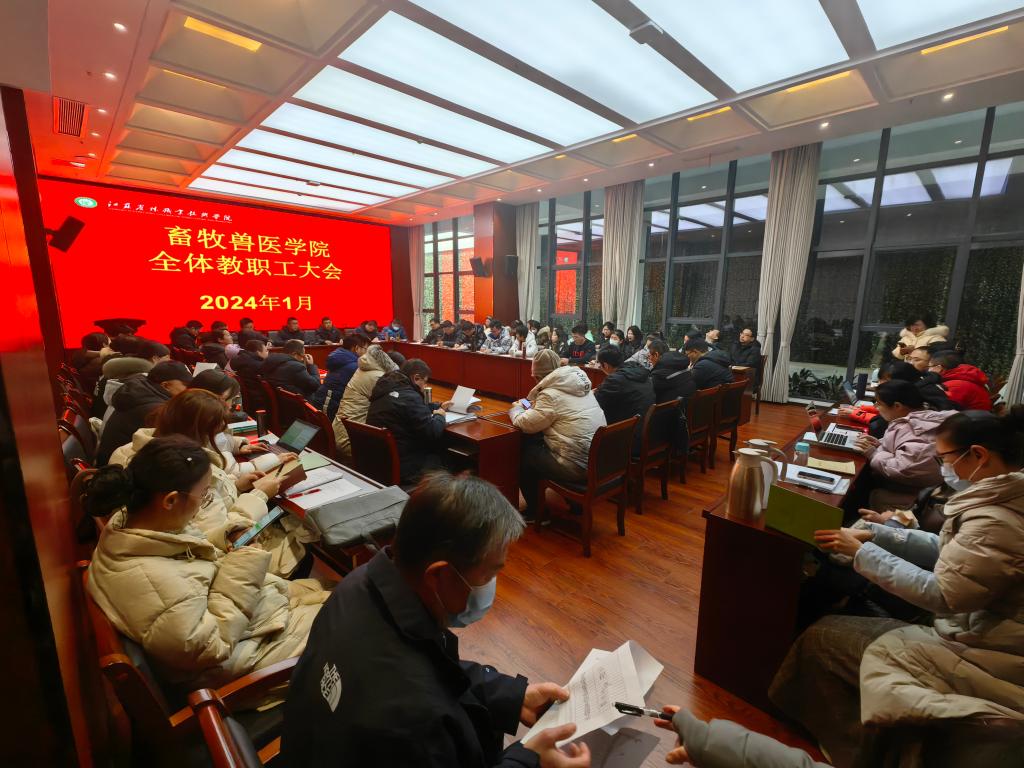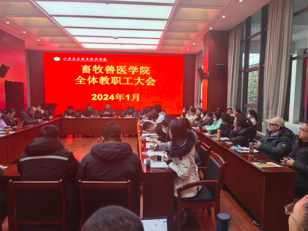 随后,党政领导及参会人员听取了各教职工2023年个人工作总结。副院长杨剑波向参会人员汇报了我院2023年度在科研工作和社会服务工作情况,尤其是国家自然科学基金项目的仍有突破,企业横向课题突破150万元,帮扶并参与西部学校成功立项国家自然科学基金等。同时提醒各位教师要做好2024年科研工作规划,根据科组划分加强团队协作,做好迎接未来科组常态化考核的准备。同时希望广大教师对于新畜牧兽医大楼内科研平台的建设提供宝贵的建议和意见。副院长王煜恒汇报了我院2023年度教学工作情况,特别是“4+0”本科培养、“3+2”专本分段培养项目进一步加深合作,在完成常规的“1+X”工种证考核工作的同时,圆满地完成了430余人的国家级工种证考核工作;同时在国际等级证书标准申报,国家、省级资源库申报和立项、“十四五”规划教材等方面有所突破,同时表明我院在国际交流方面仍有努力空间。王煜恒传达了学校在教学质量评价工作中的一些新方法和新举措,希望广大教职工进一步提升课堂教学质量为出发点,做好2024年教学相关工作。党总支副书记赵彬向大家汇报了我院“医心兴牧”的党建品牌和学生工作取得的结果。向新入职教职工介绍我院目前在校生规模和专业设置情况。尤其是介绍了企业订单班的合作办学模式、大学生“创新创业”比赛、高质量就业、招生工作中所取得的成绩,赵彬非常感谢参与到学生创业创业比赛指导、班主任管理等各项学生工作中的老师。