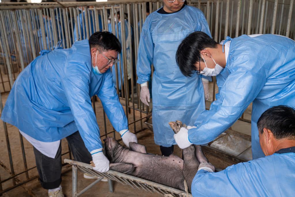 在技术人员的指导下,师生分为5个小组,穿戴手术衣、消毒器械后迅速投入实践。教师现场示范讲解仔猪阉割的关键步骤,包括组织分离、止血、缝合等外科技术,学生分组操作并实时接受指导。经过高效协作,团队顺利完成全部任务,企业技术负责人评价:“学生操作规范严谨,展现了扎实的专业功底。”