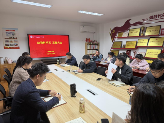 3月26日下午,畜牧兽医学院动物科学系在牧医楼307会议室召开教职工理论学习会。畜牧兽医学院党总支副书记、院长汪善锋,副院长杨剑波,系部副主任及全体教师参会,共学共进、共谋发展。